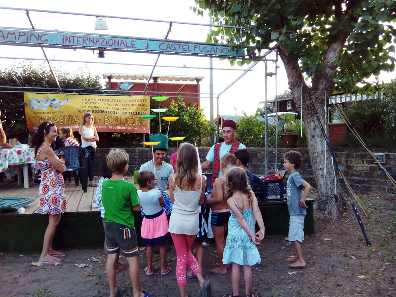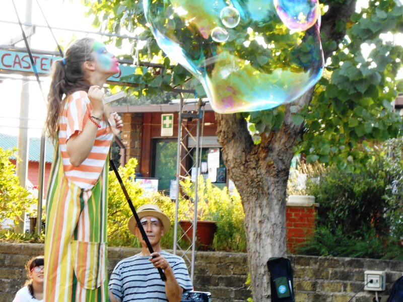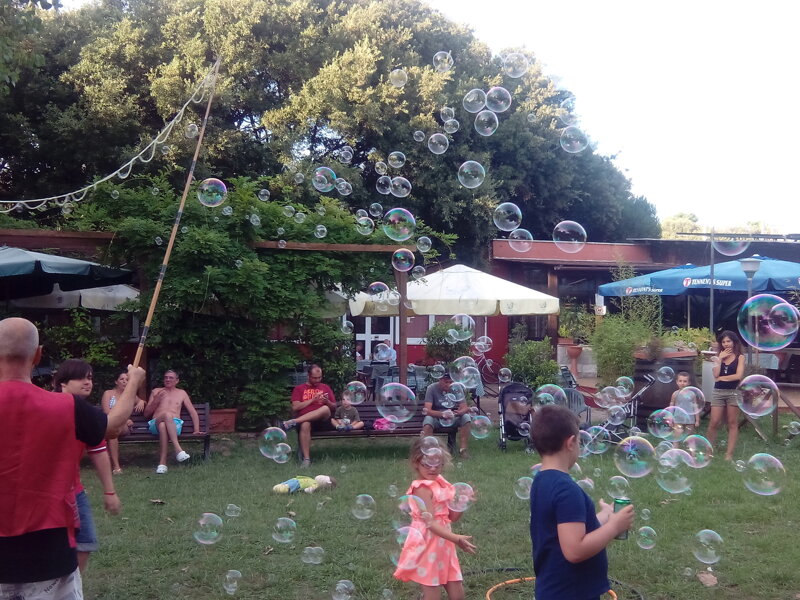 Gli animatori creano una atmosfera affascinante con particolari strumenti che disegnano nell’aria le forme leggere di bolle di sapone, con ambientazione musicale.