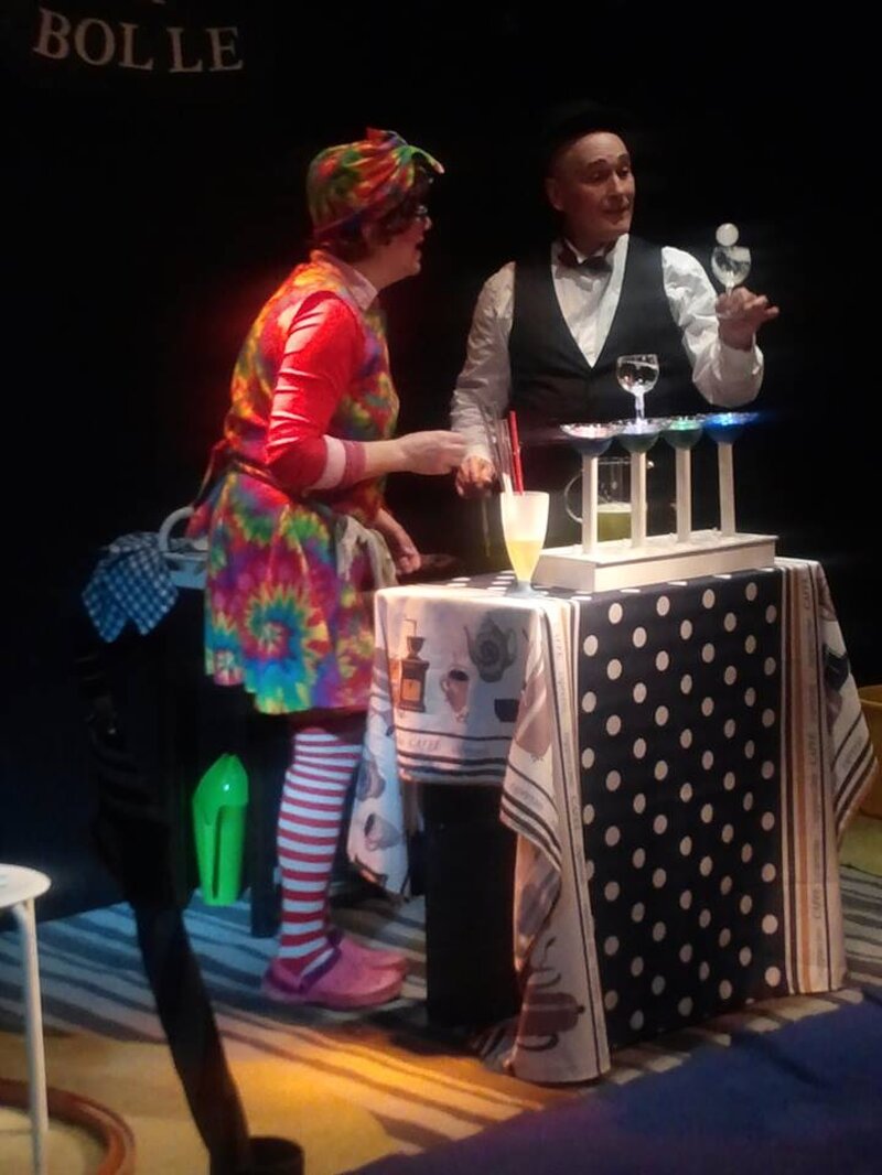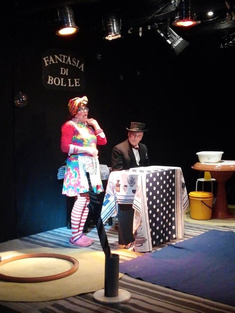 Quindi, il filo conduttore si affida all’incontro tra due personaggi apparentemente molto diversi, Pedropan, uomo d’altri tempi vestito nostalgicamente in frac, Bignè, locandiera leggiadra e donna delle pulizie, clownescamente pratica, dell’antica locanda FANTASIA DI BOLLE, in cui si incontrano.