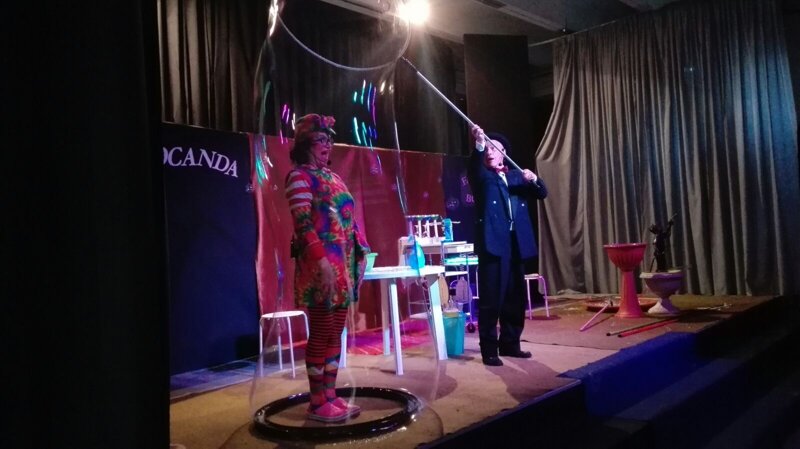 I due così cominciano a collaborare, si ritrovano a giocare a ping pong al rallenty con le bolle sbalordendo anche se stessi con infiniti giochi di geometria liquida: bolle quadrate, girandole, bolle dentro altre bolle, vulcani, razzi di bolle col fumo, insomma si ritrovano a giocare insieme in un crescendo di “scoperte” curiose e gioiose nell’uso del liquido saponoso in un carosello di bolle che escono da tutte le parti di tutte le forme, grandezze e quantità, fino ad inglobare anche tre bambini in una bolla supergrande.