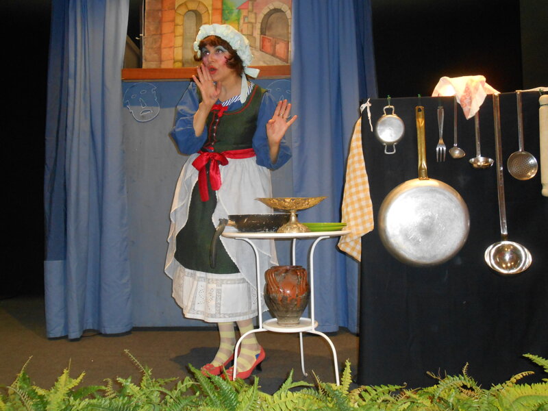 In scena abbiamo la baracca dei burattini, con fondali scorrevoli, elegantemente vestita di sipario fino a terra che scorrendo lateralmente fornisce le quinte agli attori, e una scenografia con oggettistica che rende l’ambientazione da cucina di corte.